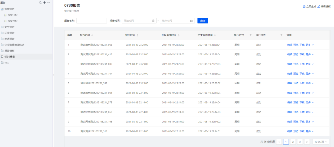通過在線拖拽的方式實現模板的搭建,并能夠在模板中設置參數用于報告的生成,并能基于報告模板設置不同的參數及生成周期定時生成報告,支持歷史報告記錄的下載、在線編輯等功能。