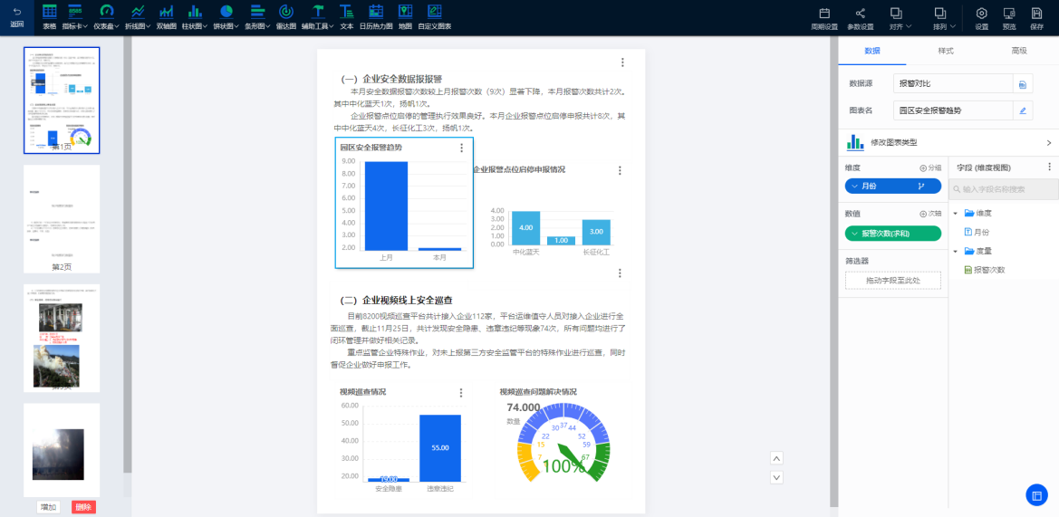 自定義報告是報告管理平臺,能夠像制作PPT一樣制作報告,通過幾步簡單操作即可實現自助式分析。在報告內,用戶不需要掌握任何SQL語言,簡單拖拽,自由靈活地對多張圖表進行組合布局,支持圖表的堆疊,排版,分組,分層等高級操作,還支持添加文本、圖片等非圖表控件,并能夠針對設置的報告模板定時批量生成報告,下載報告。